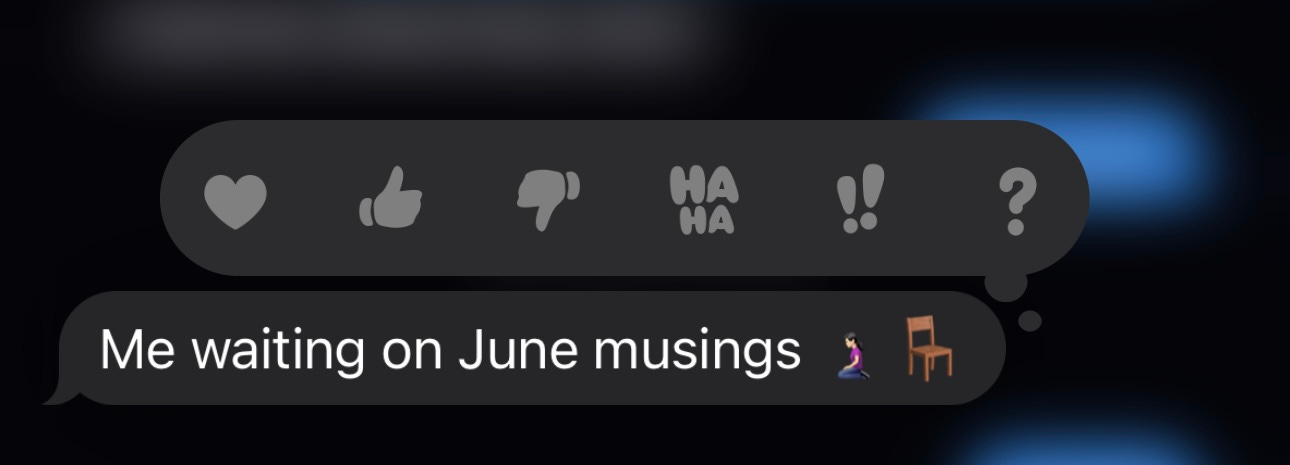 Hey guys. Remember June? I’m clicking post from the eleventh hour of July because I owe my three billion Substack subscribers last month’s musings. Thanks for waiting up for me. I’m forever indebted to my fans.
