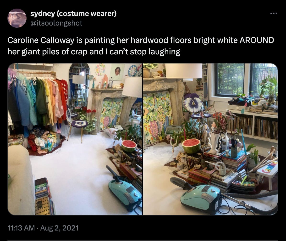 The idea of writing around the truth also reminds me of when Caroline Calloway painted her *rental* apartment floors white and instead of picking up the piles of dirty clothes and clutter she literally painted around them— which is so me-coded but also something I would never do. I would never do that, guys…